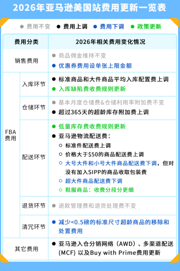 - 关键变化:AWD、MCF等服务基础费用上调,但对使用AWD智能补货及指定物流的卖家,提供最高20%的仓储费折扣。